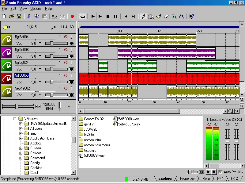 Ce logiciel reprend le concept de Music Maker et de son interface novatrice à ceci près qu'au lieu de poser les samples en "briques" les uns à côté des autres, vous dessinez dans la fenêtre principale la "partition" qui va être jouée à partir de un fichier. Rien de bien extraordinaire donc, si ce n'est que le Pitch Shifting & Time Stretching s'exécutent en temps réel, ajoutant encore à la convivialité inhérente à ce type de logiciel : vous entendez quasi immédiatement le résultat de vos modifications... Autre détail sympathique, la version 2.0 d'Acid vous permet de sauver votre composition au format WAV, MP3 ou Real Audio... Plus fort encore, le Time Stretching s'applique automatiquement à toute boucle dont le tempo n'est pas conforme à celui que vous avez défini! Exemple : Si vous placez une boucle de batterie dont le tempo est à 120 BPM et que vous désirez lui ajouter un groove de basse à 140 BPM, vous n'aurez pas besoin de recourir à votre éditeur audionumérique. ACID calera automatiquement la basse sur la batterie à 120 BPM et ce, sans aucune opération destructive sur votre fichier original! Cette fonction débrayable simplifie vraiment le montage et vous permet surtout de vous consacrer à l'essentiel : la musique. Bien évidemment, vous pouvez aussi faire varier les volumes et panoramiques de chaque séquence audio. Mieux, vous pouvez appliquer plusieurs effets externes puisque le logiciel admet les plug-ins Direct-X. Sachez enfin qu'une fois votre tube interplanétaire créé, vous pourrez même mettre votre chef d'oeuvre sur CD puisque Acid, dans sa dernière version, est à même de piloter un graveur. Conclusion : Acid est un soft, qui à défaut de partir d'une idée originale, est tellement bien pensé et réalisé qu'il s'impose, et de loin, comme le meilleur de sa catégorie... Faire de la musique n'a jamais été aussi simple! |
